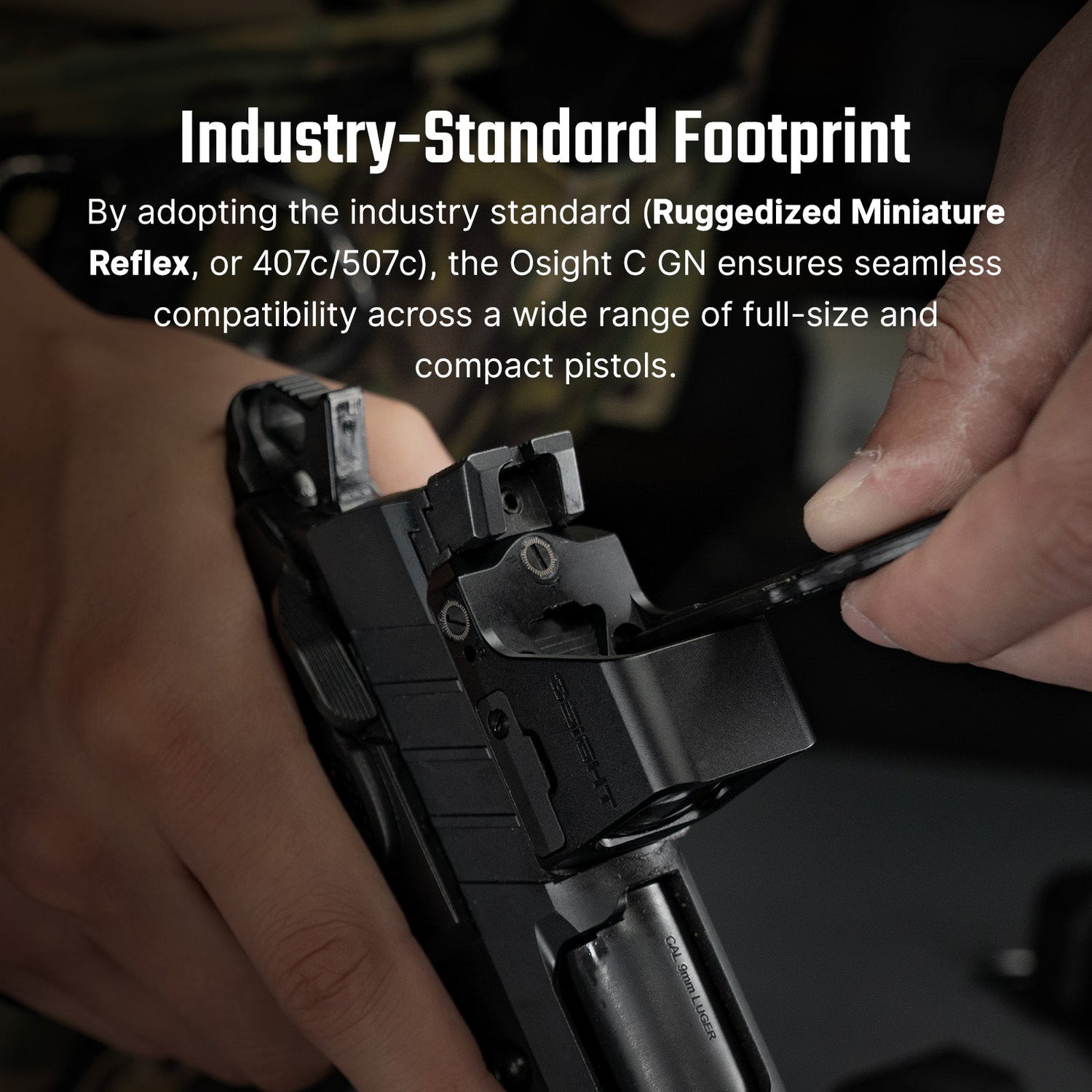 La óptica utiliza la huella RMR ampliamente adoptada, también conocida como huella 407C / 507C. Por ello, es compatible con muchas pistolas que admiten ópticas con patrón RMR o utilizan placas adaptadoras compatibles.