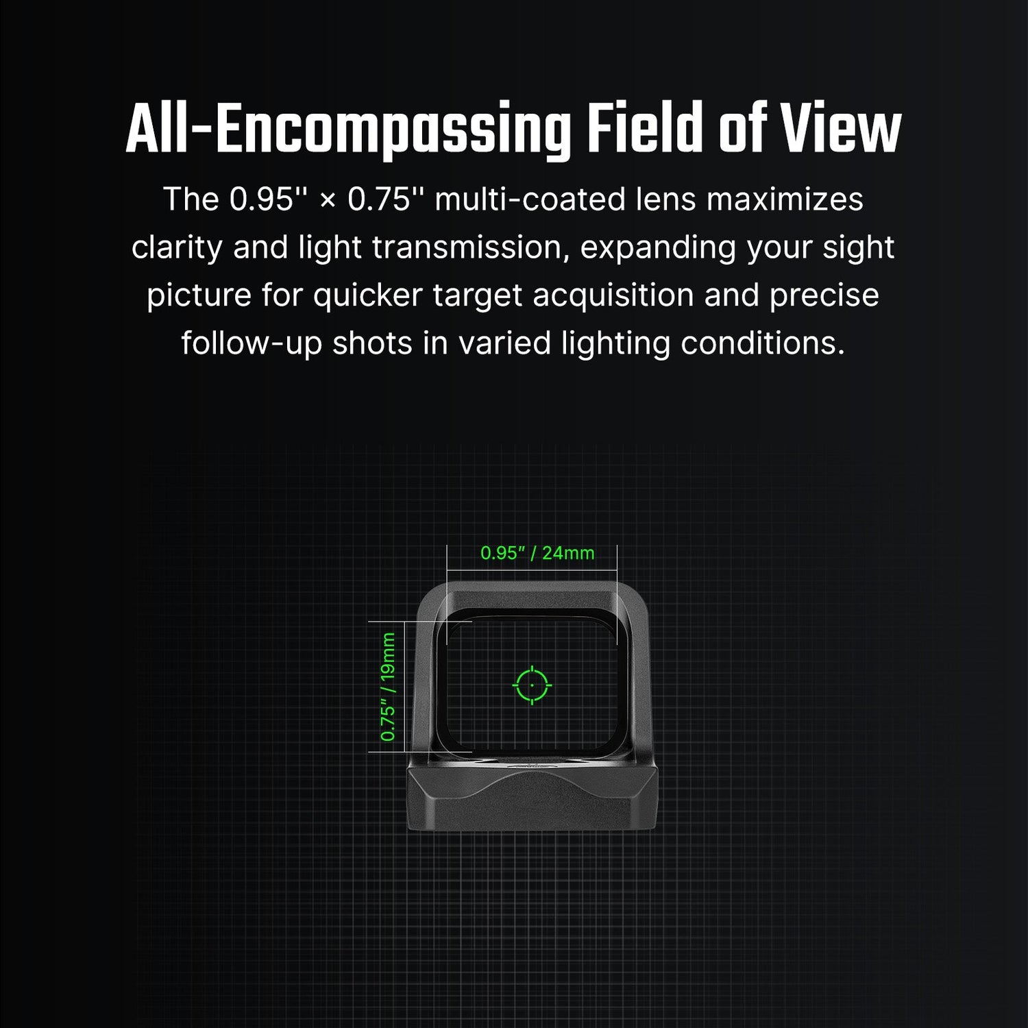 La óptica utiliza una lente multicapa diseñada para mejorar la transmisión de luz y reducir los reflejos. En la práctica, esto significa una imagen de mira más brillante, mejor claridad y adquisición de objetivo más rápida al disparar en diferentes condiciones de iluminación.